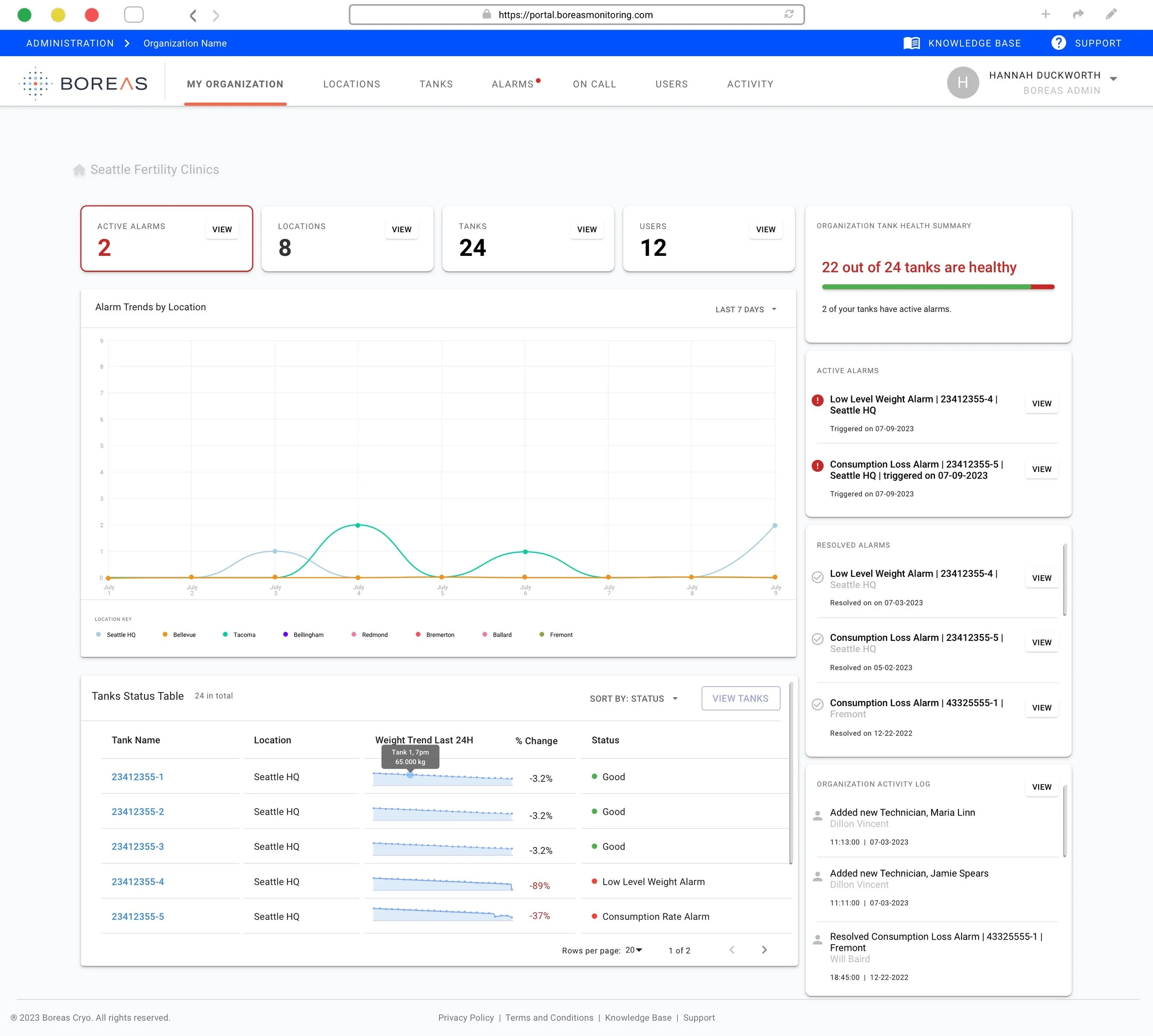 View over 34,000 data points Through the portal, users can access comprehensive data on liquid nitrogen levels, ambient temperature of the tanks, and other vital parameters. The platform offers real-time alerts and notifications, enabling timely intervention in case of any deviations or anomalies. This ensures that potential issues such as excessive evaporation or missed fill cycles are promptly addressed, minimizing the risk of damage to valuable biological materials.